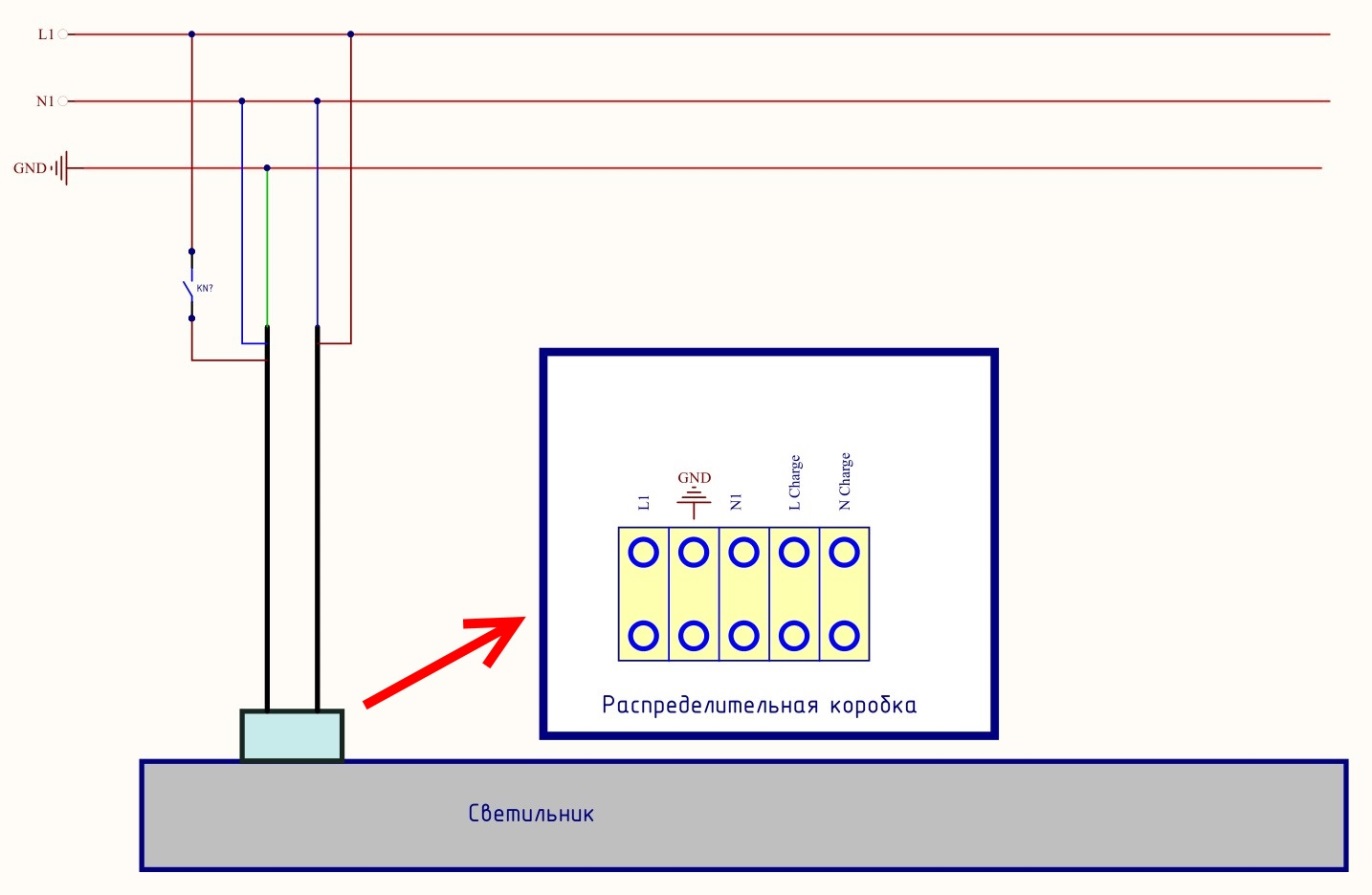 Светильник с ИБП достаточно подключить к аварийной линии и к линии основного освещения. После появления на аварийной линии напряжения 220VAC ИБП включится.