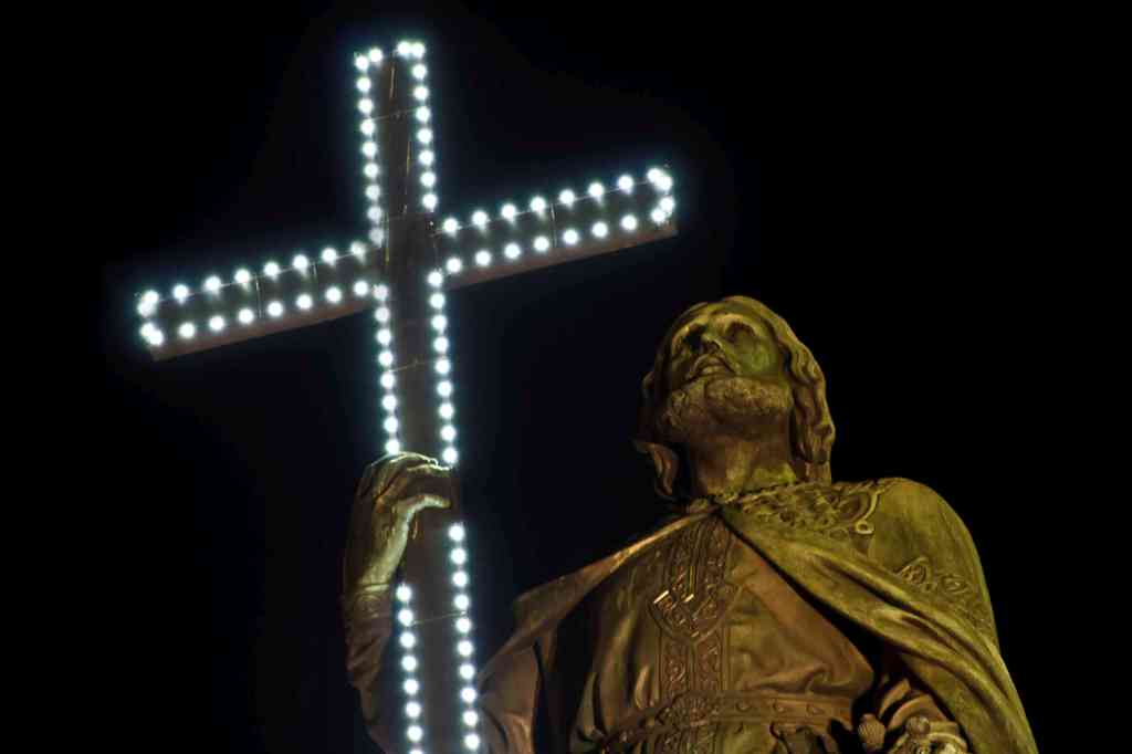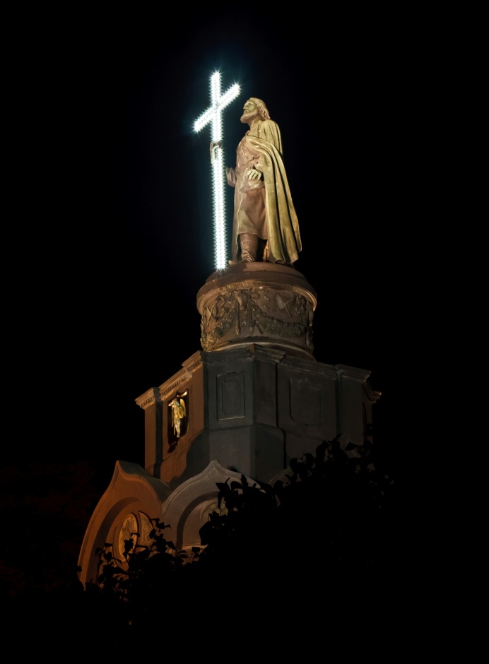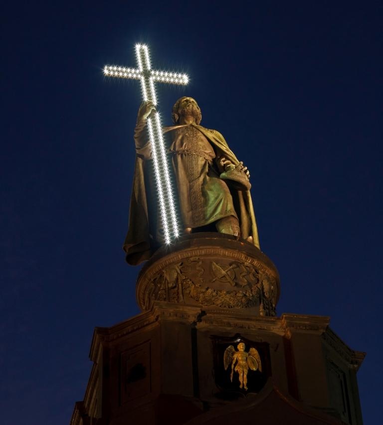 В ночной тьме этот свет был виден издалека, и писателю Михаилу Булгакову навсегда запомнилось, как "лучше всего сверкал электрический белый крест в руках громаднейшего Владимира на Владимирской горке".