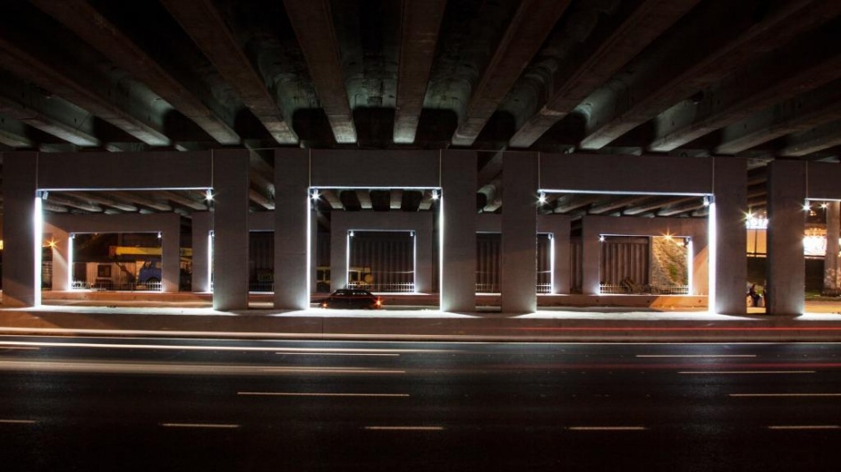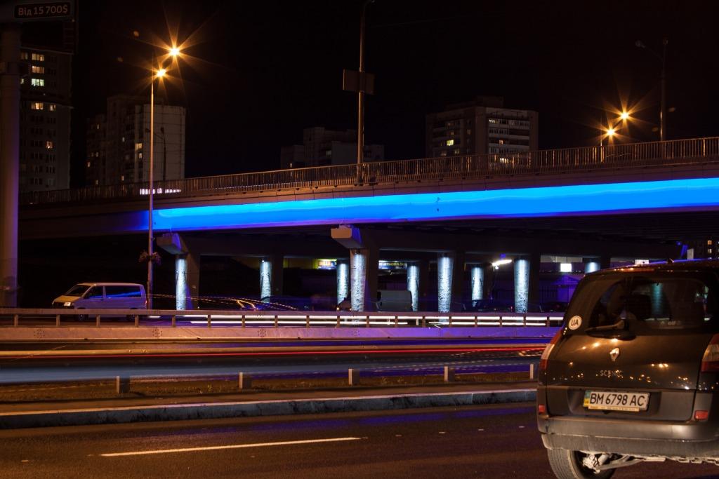 Мост Позняки, мост Осокорки были подсвечены светодиодными прожекторами и магистральными светильниками нашего производства. Харьковский путепровод - модулями Osram (белого, красного, бирюзового, синего и зеленого цвета).