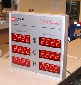 Светодиодные информационное табло – это эффективный способ отображения цифровой символики, главным образом для подачи информации об изменяющемся курсе валют. Устройства активно используются отделениями банков, пунктами обмена валют. Для изготовления элементов индексации применяют светодиоды, благодаря чему такое электронное табло легко привлекает внимание на улице.